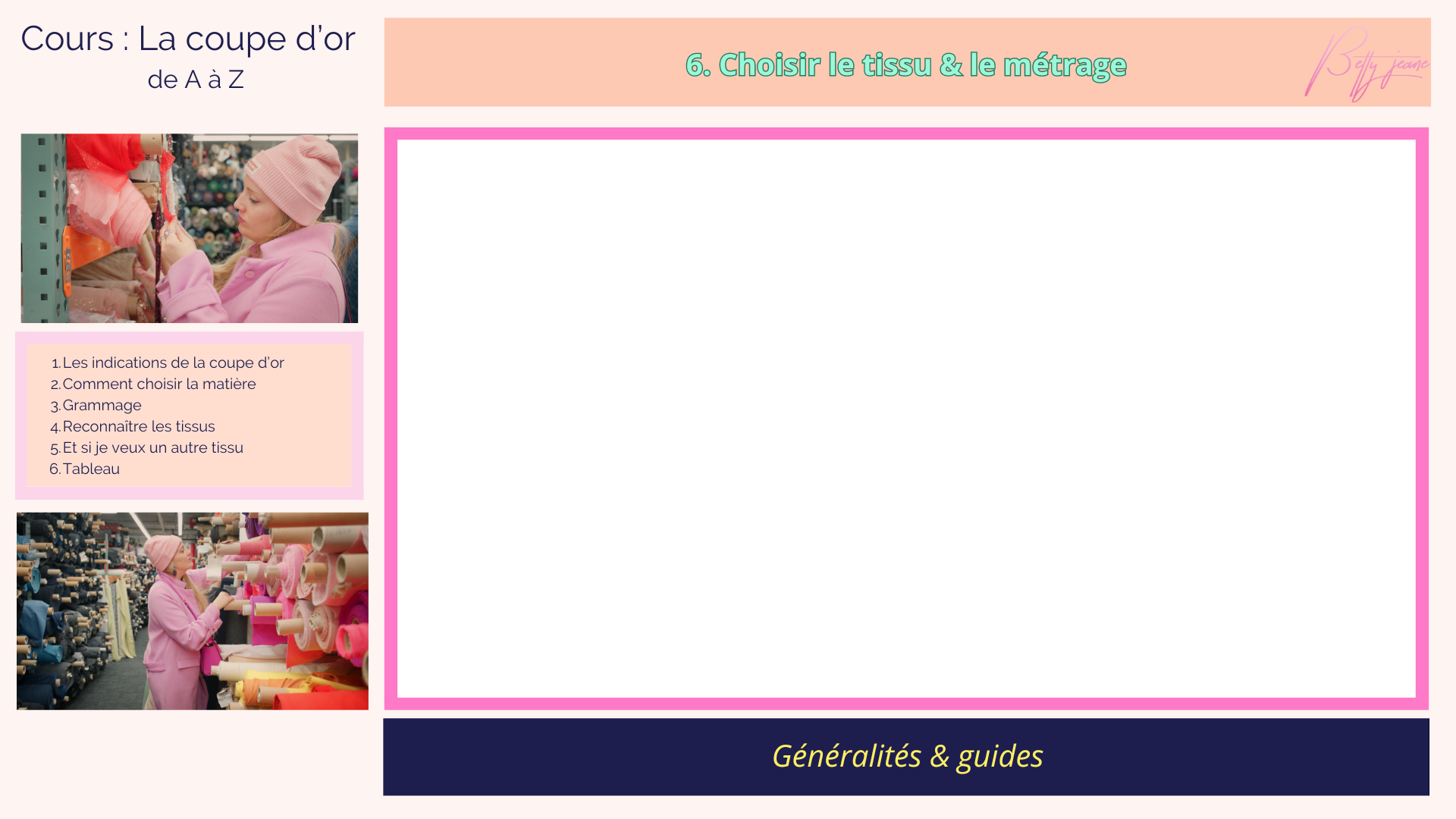De la double gaze ou du velours ? En 180g/m2 ou plutôt en 300 ? Pour ne plus jamais paniquer à la question "Je vous coupe combien de mètre?" 📏 Ce module nous guidera sur les généralités des tissus. ✂️
